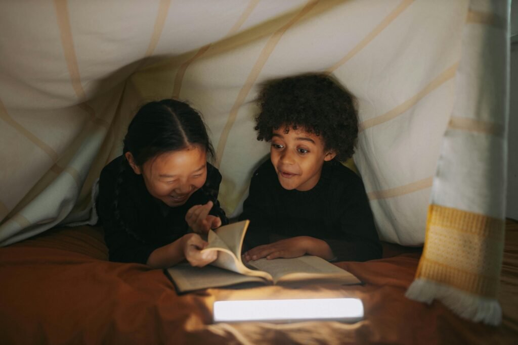 Alles, was du brauchst: Decke, Bücher, Licht, vielleicht ein Kakao. Und ja, manchmal schlafen die Kinder danach sogar ein paar Minuten ein. (Manchmal!)
